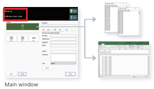 VisEase™ is a simplified control application offered in response to users that prefer to measure data within the control software by the simplest way possible, without data analysis, report creation, or printing. All the necessary functionality, from measurement mode selection to starting analysis and setting wavelengths, is integrated in one simplified main window for easy one-click operation. It is ideal for users that only want to view measurement values, save data as text, or process data in Excel®. After simple measurement, the optimal output method can be selected based on how the data will be used.